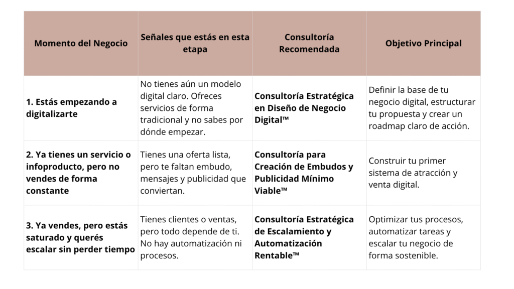 Consultoría Recomendada Según el Momento de tu Negocio Digital